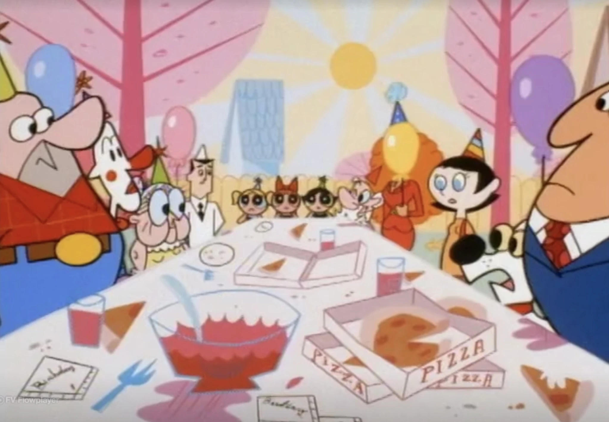 - Since she is wearing her bow, Blossom is the only Powerpuff Girl to not wear a party hat.