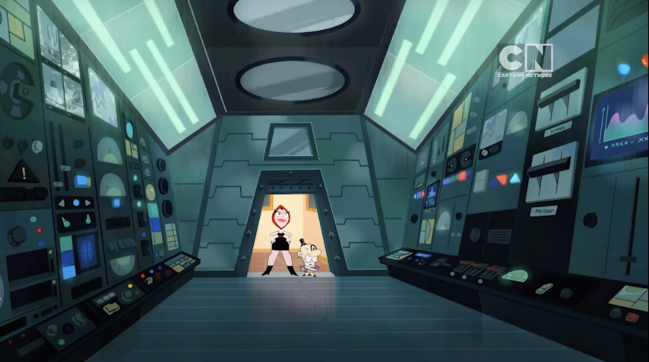 - This episode uses another variant of the classic episode outro screen, in which one scene from the episode segues into the pulsating hearts. The girls (in their normal poses from the original episode outro screen) at the Mayor below pop up as the Narrator says "And so, once again, the day is saved, thanks to The Powerpuff Girls, and the Action Mayor!". The episode outro then cuts to a scene of Miss Bellum reading a newspaper at the beach. Miss Bellum then says "I knew you'd do just fine!".
