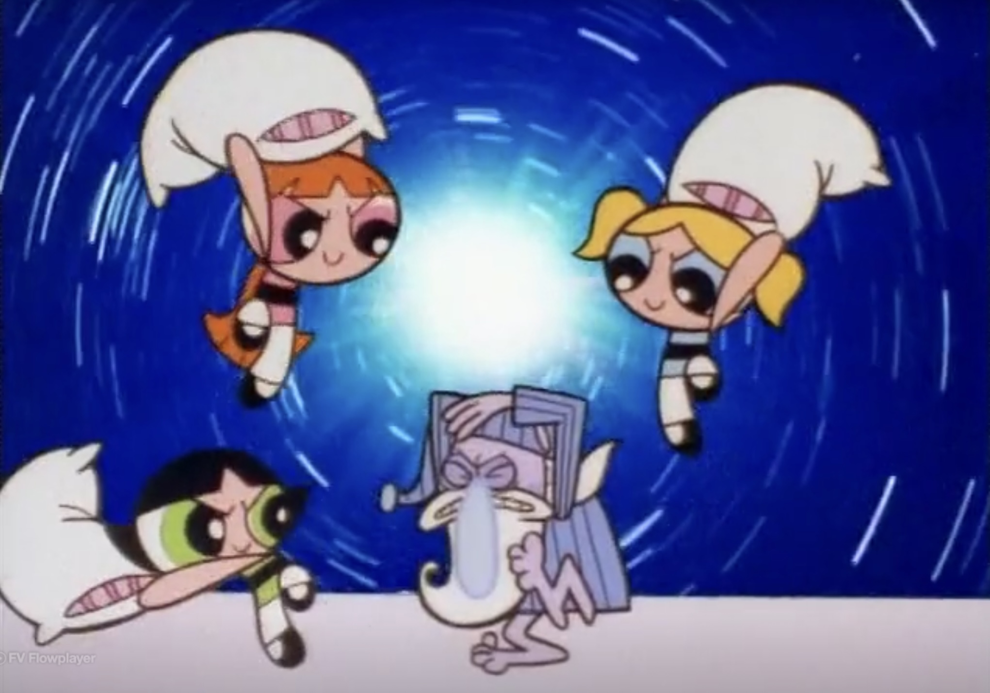 - As the Girls float to their bed, Blossom's and Bubbles' pink and blue blankets are on the left and middle of the bed respectively. As they lay their heads on their pillows, the colored blankets switch places.