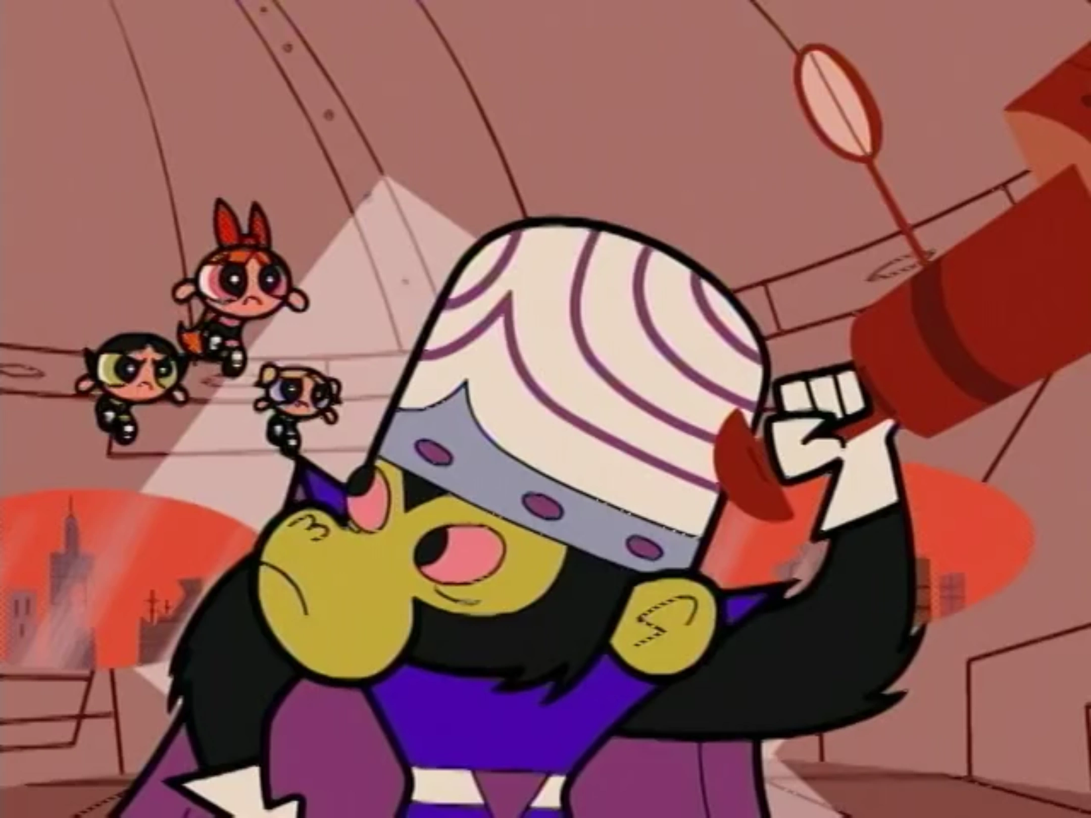 Mojo going berserk in front of the Alien Leader, behaving like a wild chimp, is a possible reference to the Rowdyruff Boys episode, where Mojo gets thrown in jail for the third time and goes insane, throwing a tantrum.