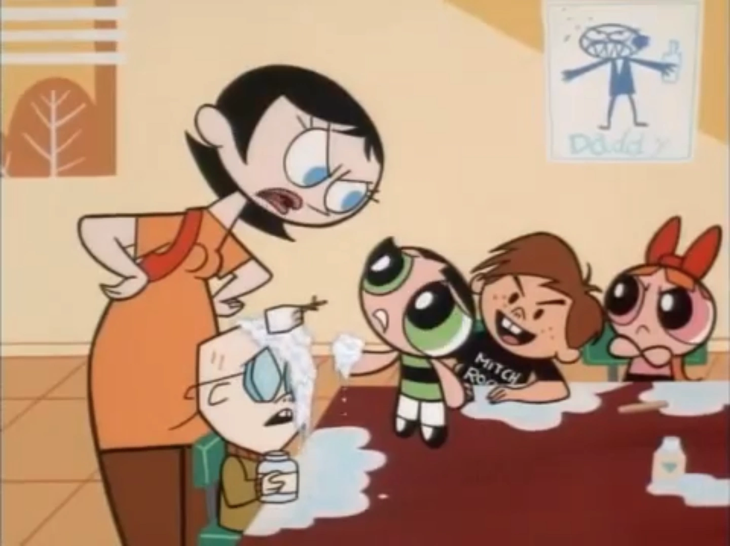- In several shots, while in the classroom, there is a drawing on the wall by an unknown student showing an overraged, drunk man with the word "Daddy" written underneath (most notably visible when Buttercup is about to throw paste at Elmer). This is the only instance in the series where domestic violence is implied in an episode.