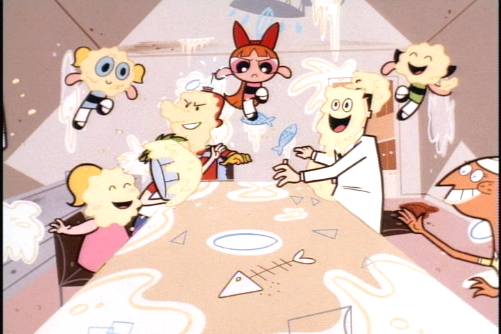 Mealtime comes, and the Girls all rush through their food as they keep their eyes on the Professor; however, it is stalled as the Professor is ordered by Harold to slowly eat a single pea. When Marianne serves coconut cream pies for dessert, inadvertently stalling Harold, Blossom takes the opportunity to attack by throwing her pie at Harold, only for him to retaliate, inciting a fun pie fight between the Professor, the Girls, and the Smiths. At this point, the police show up, only to take Harold away (on the idea that he had a gun), and Professor and the Girls leave in a haste. With Harold arrested, Marianne and the rest of her family will have the revenge on the Girls and the Professor for ruining their dinner party - which is a prelude to a later episode.