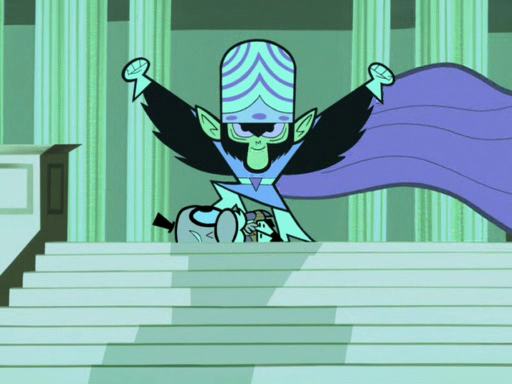 Eventually they take the fight to Mojo, who uses the Professor as a hostage against them declaring his intention to rule the world, "even if it means taking EXTREME MEASURES!!!" At that moment, Mojo pumps so much Chemical X into himself that he grows to the size of a giant. Mojo then proceeds to rip off the dome of Townsville City Hall and places it on his brain as his new helmet. The girls tell the Professor they cannot let Mojo win and decide to finish, as he sheds a tear of pride.